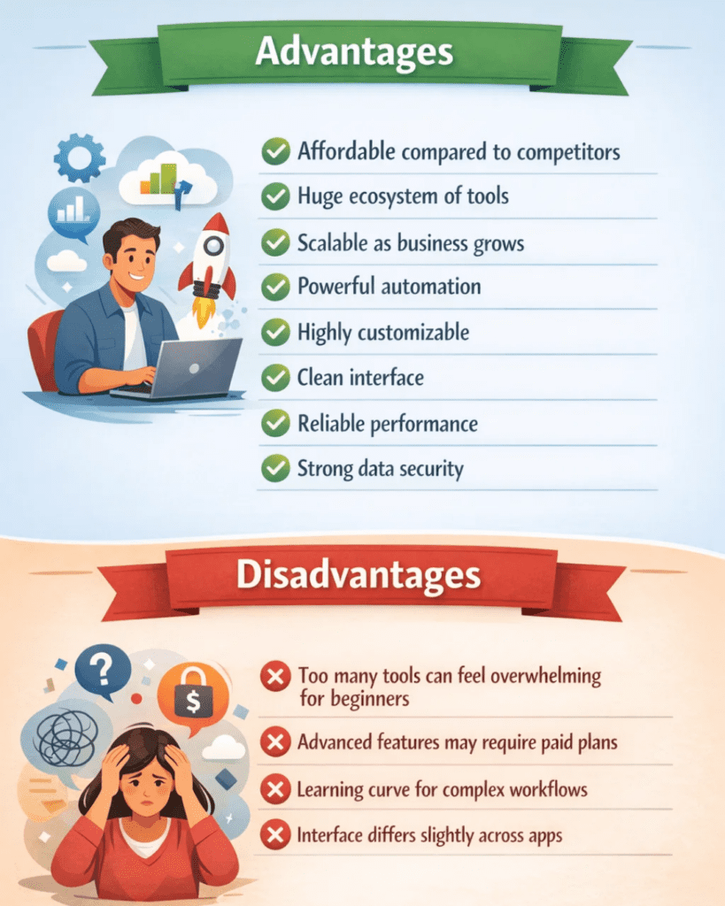 Instead of using different tools from different companies, Zoho integrates everything into one system. This centralization improves productivity and reduces operational complexity.